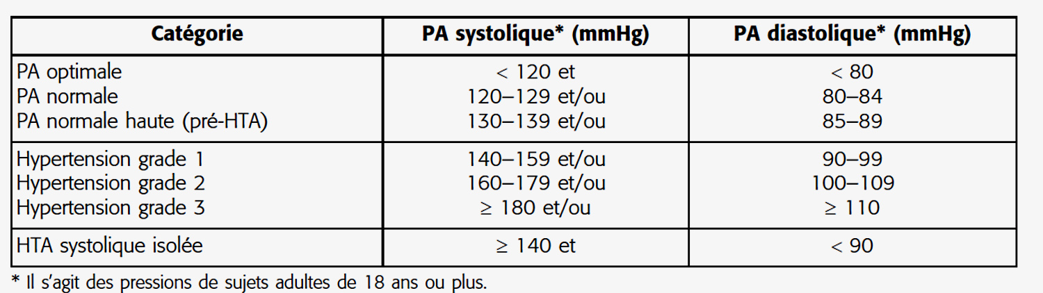 La distribution des pressions artérielles (PA) ou tensions artérielles (TA) dans la population est continue, sans rupture de courbe franche. En revanche, il existe une relation forte, indépendante, continue, progressive, constante ayant une valeur de prédiction, entre le niveau de la TA et l’incidence des accidents cardiaques (insuffisance ventriculaire gauche) et vasculaires (accidents coronariens aigus, AVC). Les limites de l’HTA sont définies en fonction des niveaux de TA à partir desquels le risque cardiovasculaire augmente de façon significative et rapidement progressive, mais baisse en revanche si une intervention thérapeutique ramène la pression artérielle à des valeurs plus basses.