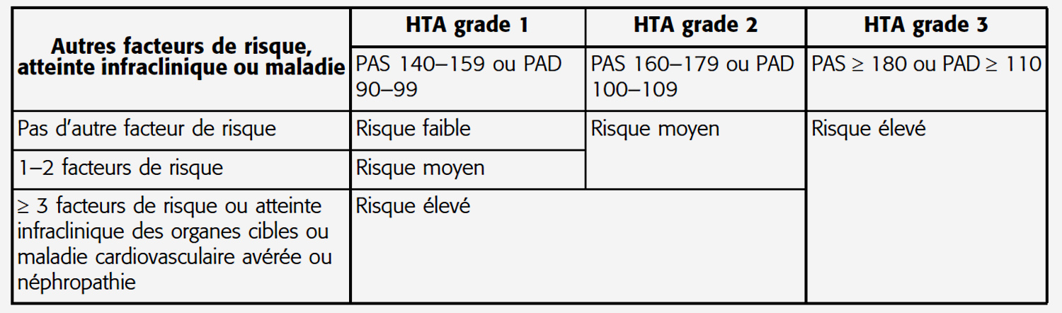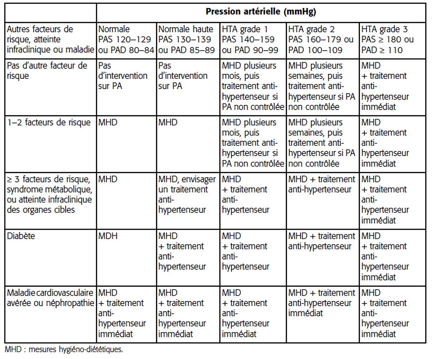 Tableau 3. Indication thérapeutique en fonction du risque cardiovasculaire global et du grade de l’HTA.