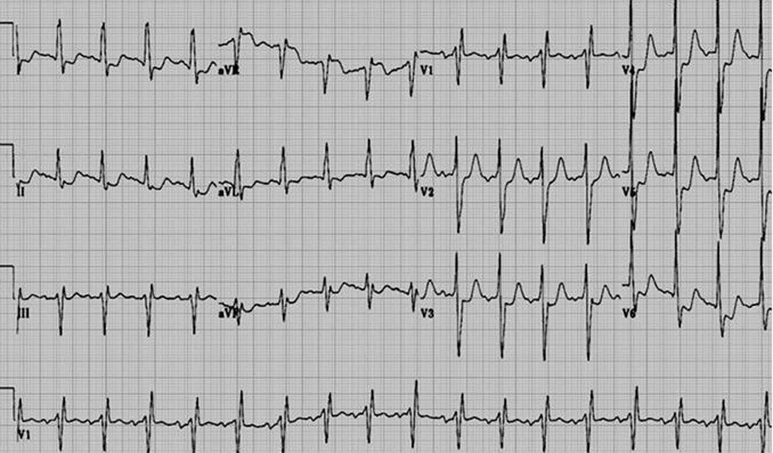 Peu après son admission, le patient présente une douleur précordiale identique à celle qui l’a conduit à consulter. Un ECG est enregistré durant la crise (fig. 1). La PA de 160/85 mmHg. L’examen rapide est identique.