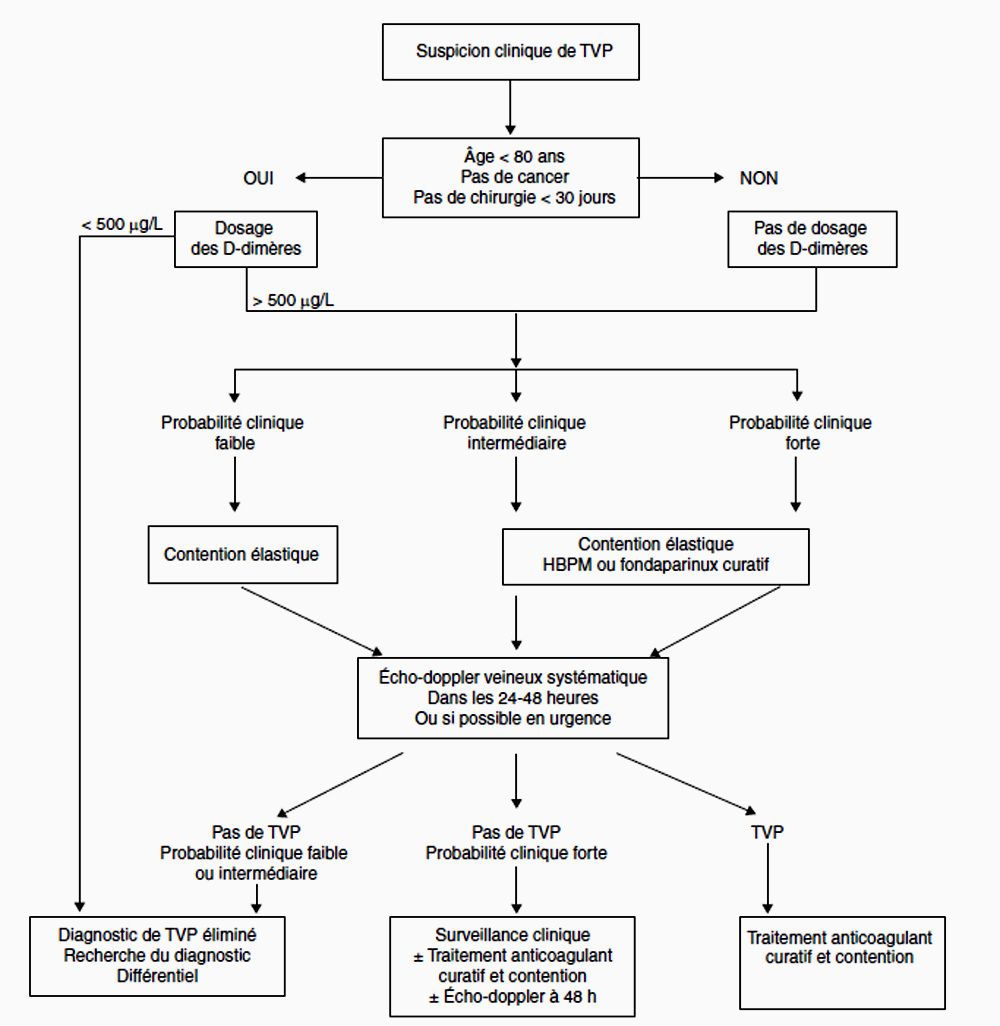 Les stratégies diagnostiques sont adaptées au score de probabilité clinique, au dosage des D-dimères et à l’écho-doppler veineux des membres inférieurs (figure 1).