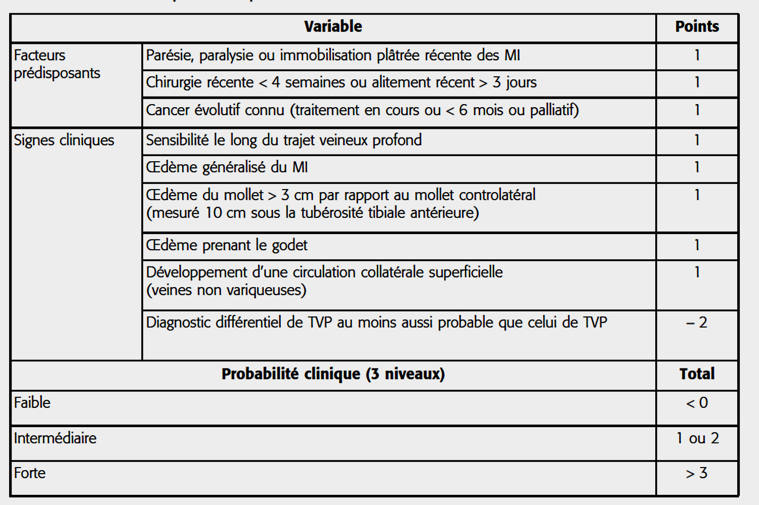 Baser le diagnostic de TVP sur les signes cliniques fait courir le risque d’un traitement inutile, coûteux et dangereux. C’est sur un faisceau de signes cliniques que l’on évoque la possibilité d’une TVP et la probabilité clinique a priori de TVP est d’autant plus élevée qu’il existe des circonstances favorisantes, la certitude diagnostique n’étant apportée que par des examens complémentaires. Le passage de la suspicion clinique à la confirmation paraclinique s’accompagne d’un abandon du diagnostic plus ou moins fréquent selon la localisation du thrombus. Les examens complémentaires confirment la suspicion clinique dans seulement 10 % des cas pour les TVP surales et 30 % des cas pour les TVP proximales.