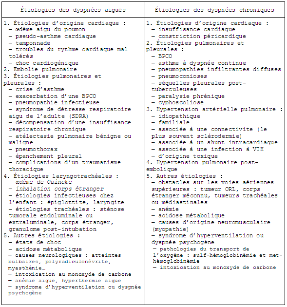 Une dyspnée inspiratoire oriente vers une cause laryngée, laisser le patient assis et éviter l’examen de l’oropharynx ; progressive elle évoque une cause néoplasique (cf. dyspnée chronique, chapitre 3).Une dyspnée expiratoire avec ronchi ou sibilante oriente vers asthme ou BPCO.