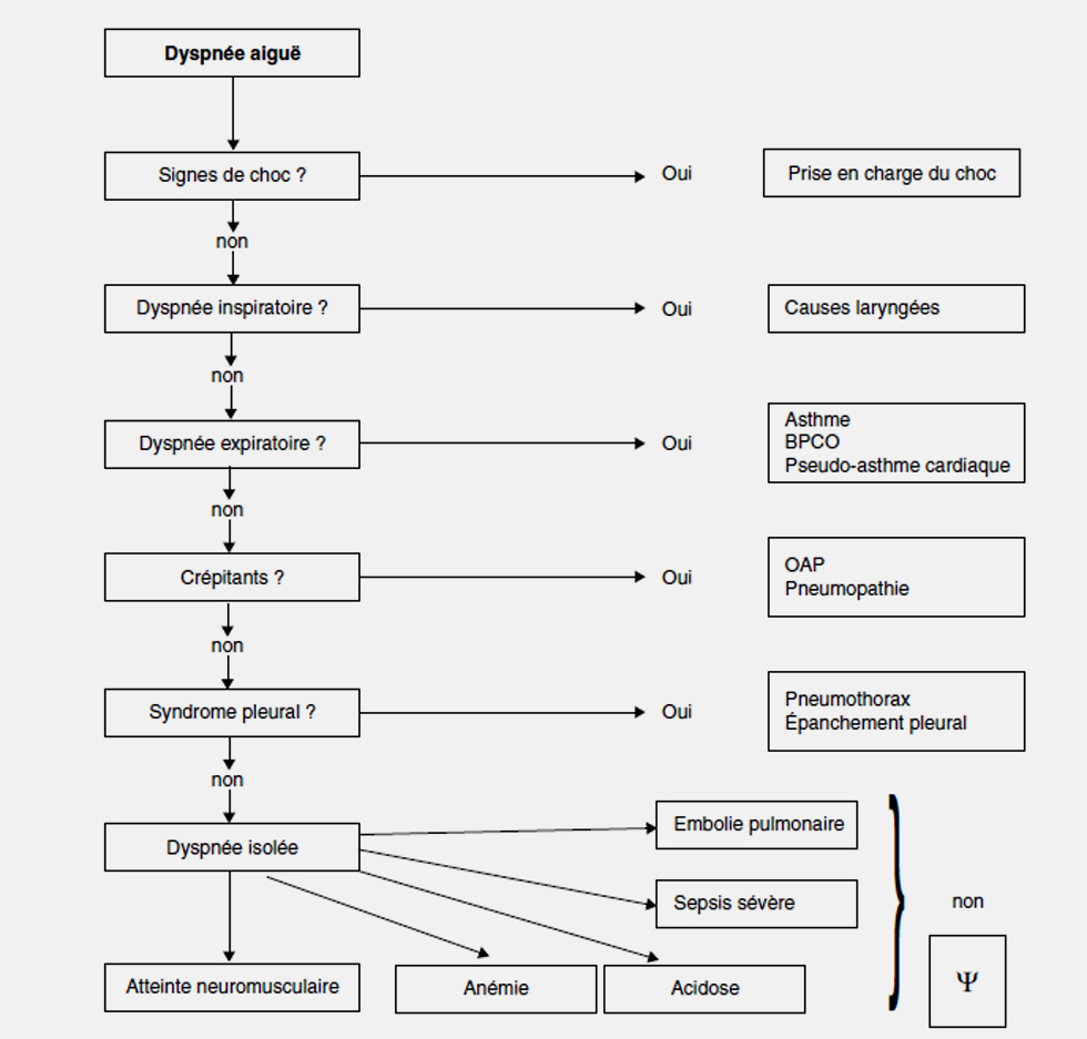 Une dyspnée isolée doit faire rechercher l’embolie pulmonaire (la douleur est inconstante) ou un sepsis sévère ou une anémie ou une acidose métabolique. Par élimination, il peut s’agir d’un syndrome d’hyperventilation ou dyspnée psychogène.