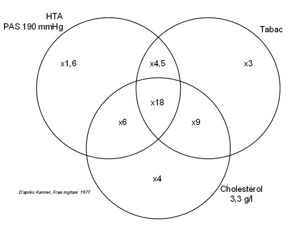 Bien entendu l’estimation du risque ainsi obtenue doit être majorée si d’autres facteurs de risque sont présents (obésité, sédentarité, HDL-cholestérol bas), en cas de diabète ou d’antécédents familiaux d’accidents cardio-vasculaires précoces.