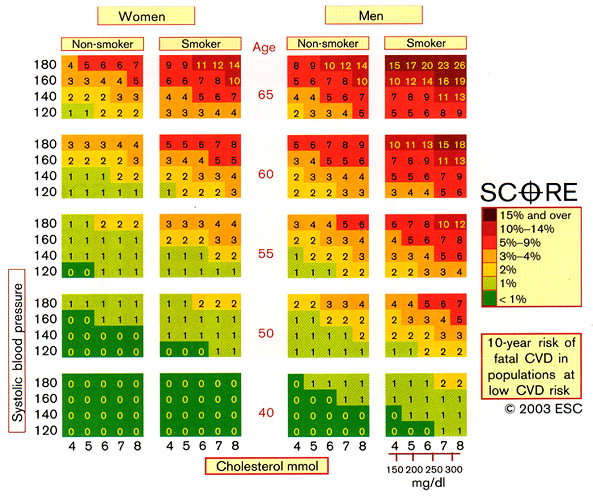 Différents moyens sont à la disposition des médecins pour évaluer ce risque athérothrombotique global: équations qui fournissent ce risque lorsque le niveau des facteurs considérés est entré dans un ordinateur ou une calculette ou, à l’opposé, simple décompte des facteurs de risque. On peut aussi utiliser une grille comme celle qui suit (recommandée par la Société Européenne de Cardiologie figure 2) , tenant compte des facteurs suivants : sexe, âge, tabagisme, taux de cholestérol total et niveau de pression artérielle systolique. Elle donne pour les pays Européens le risque de décès cardio-vasculaire à 10 ans.