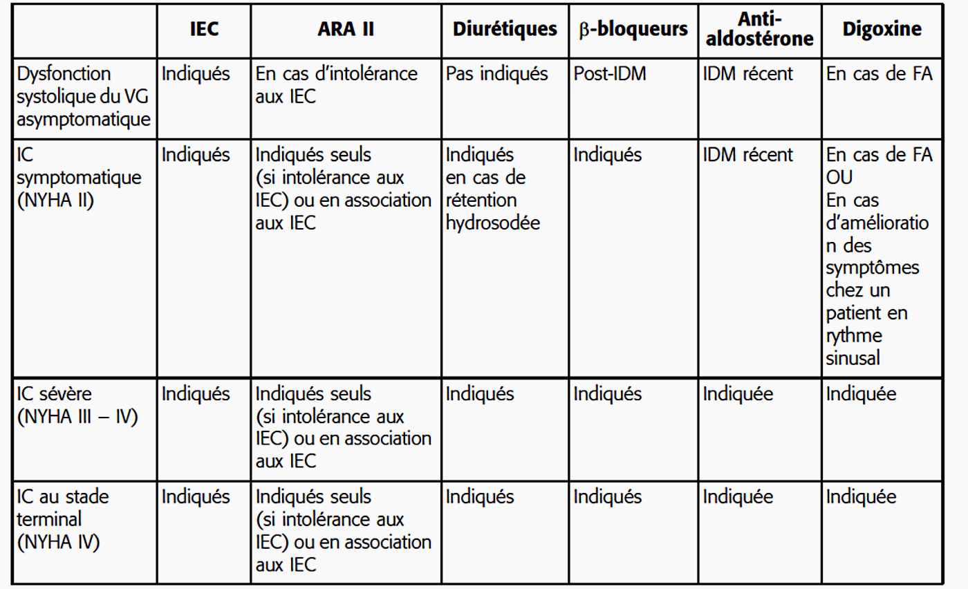 Ils sont recommandés en première intention chez tous les patients, symptomatiques ou asymptomatiques, présentant une dysfonction systolique du VG (FEVG < 40–45 %).