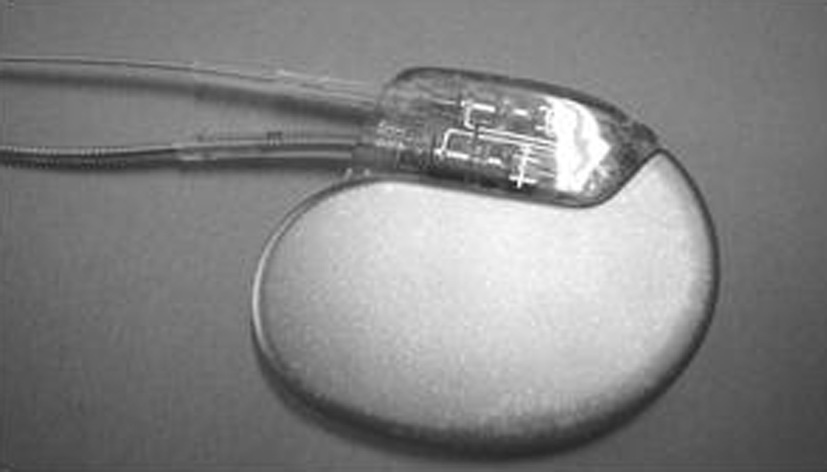 Les stimulateurs (pacemakers, figure 5) sont classés en fonction du mode de stimulation employé, la nomenclature utilise un code à trois lettres. On distingue par exemple les stimulateurs monochambres qui stimulent les ventricules via une électrode vissée à la pointe du ventricule droit qui fonctionnent en mode « sentinelle » de type VVI. Les stimulateurs séquentiels double chambres stimulent successivement l’atrium via une sonde vissée dans l’auricule droit puis les ventricules en mode DDD. Il existe aussi des stimulateurs biventriculaires qui stimulent simultanément le ventricule droit et le ventricule gauche via une sonde supplémentaire introduite dans une branche veineuse latérale gauche du sinus coronaire.