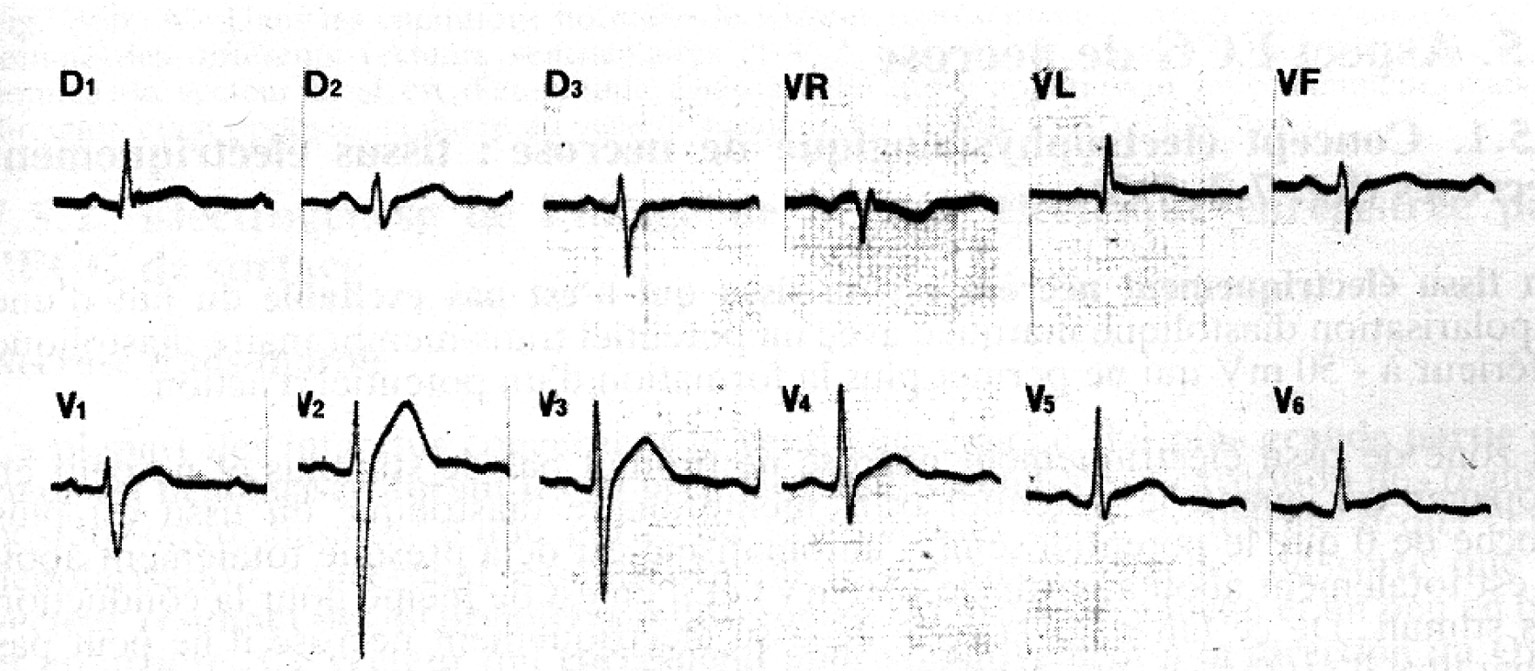 Le syndrome de Wolff-Parkinson-White traduit la présence d’une fibre ectopique connectant l’atrium au ventricule, il associe un PR court (> 120 ms) et un élargissement de QRS, par empâtement du pied de QRS ou onde δ, à des anomalies de repolarisation (figure 26).