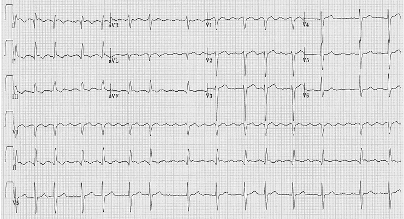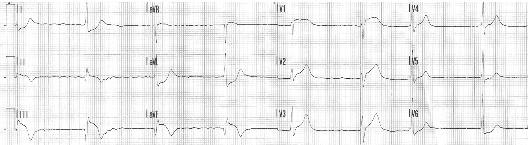 Pas de piège ici. Il s’agit d’une onde Q de nécrose en inférieur (D2, D3 et aVF) et dans toutes les précordiales sauf V1 associée à une onde T négative en latéral. L’ensemble évoque une séquelle d’infarctus circonférentiel.