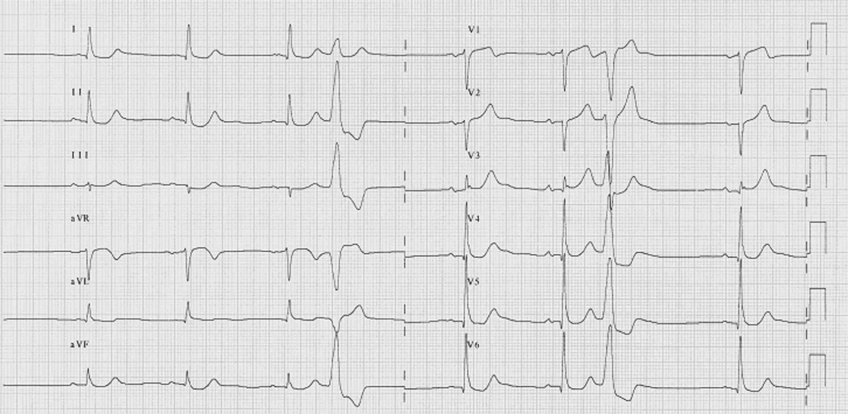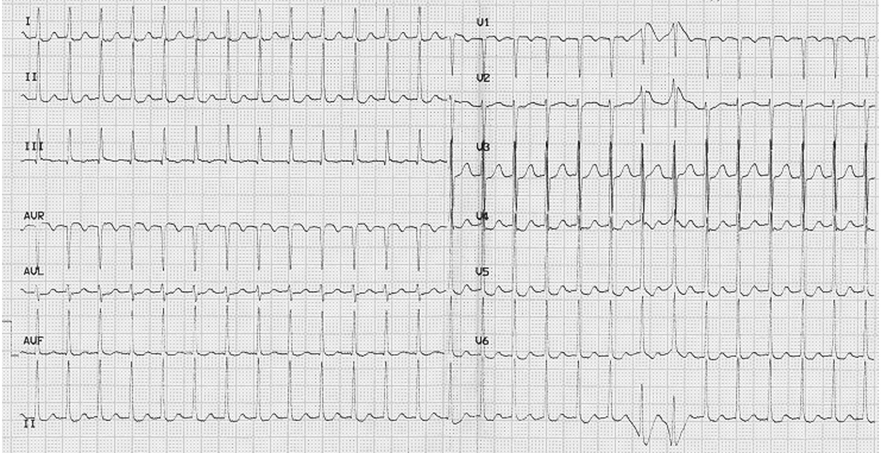 Sokolow à 35 mm, durée de QRS insuffisante pour évoquer un bloc gauche complet, donc hypertrophie ventriculaire gauche et deux extrasystoles ventriculaires.