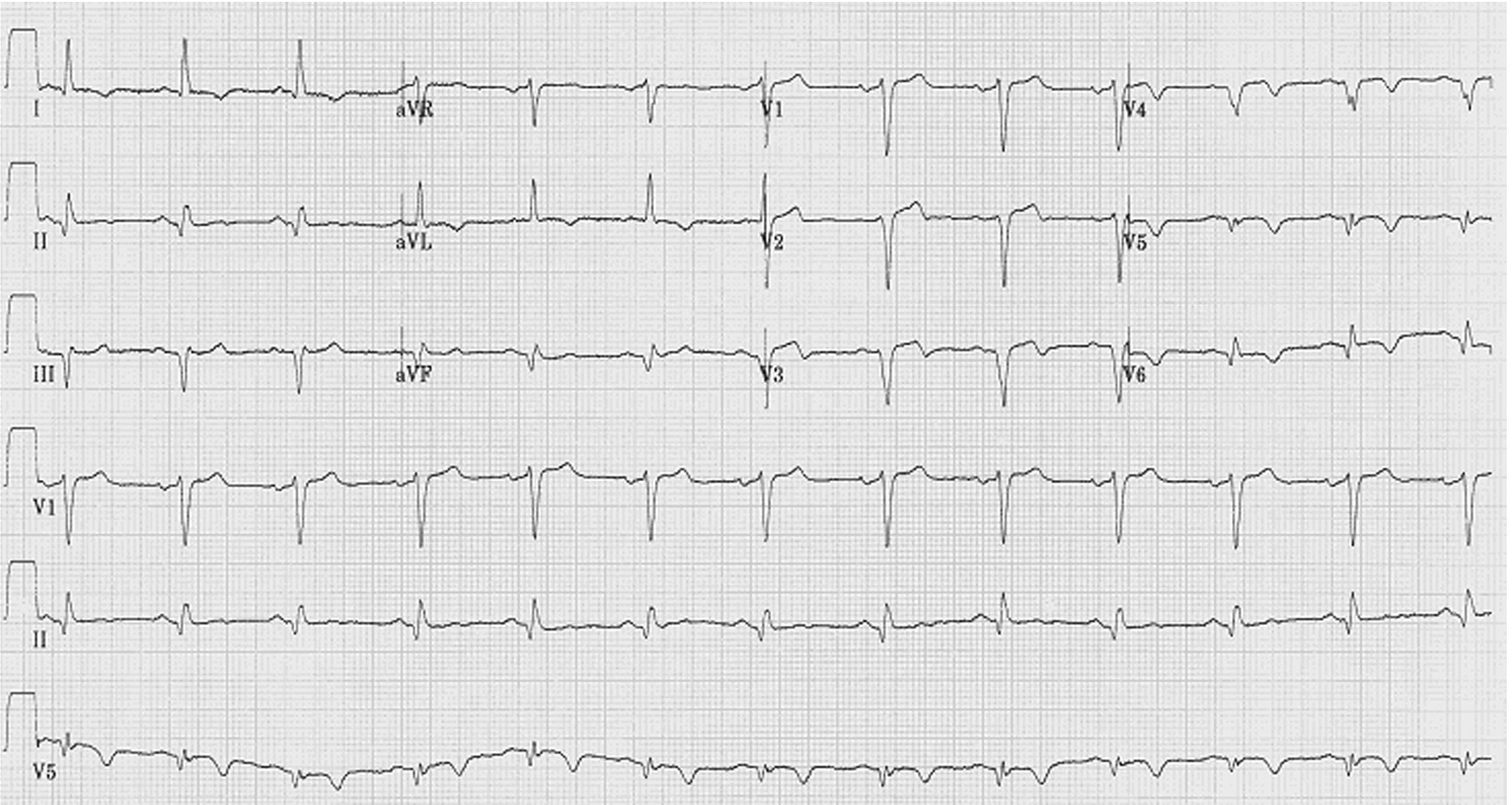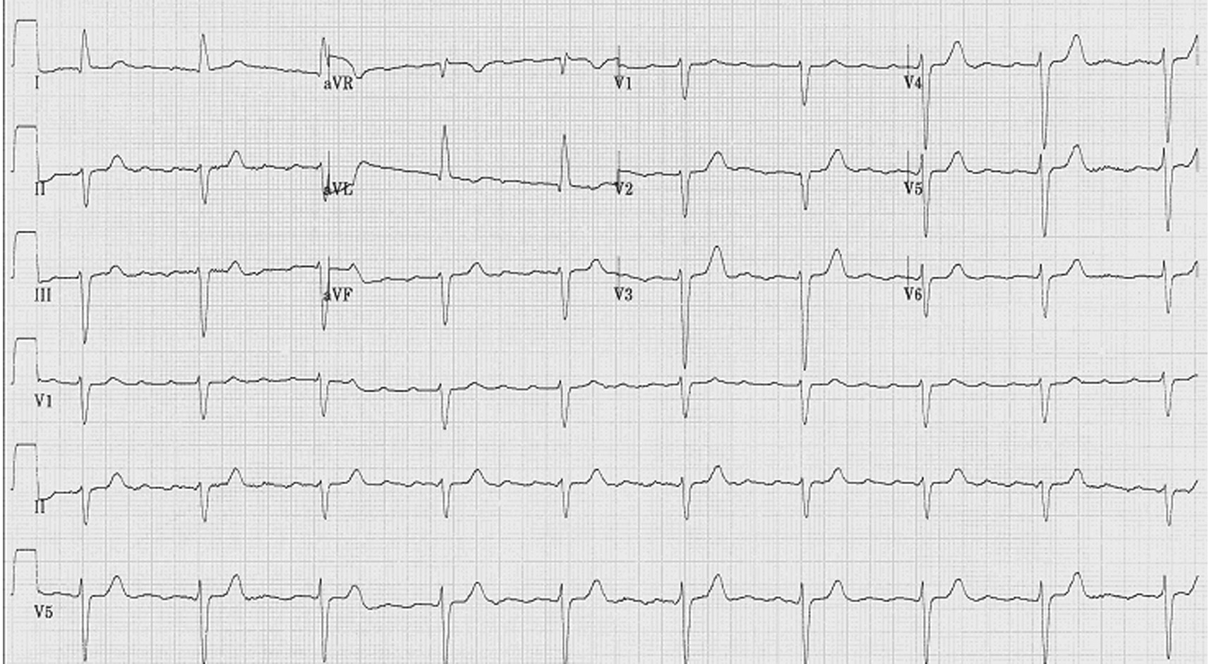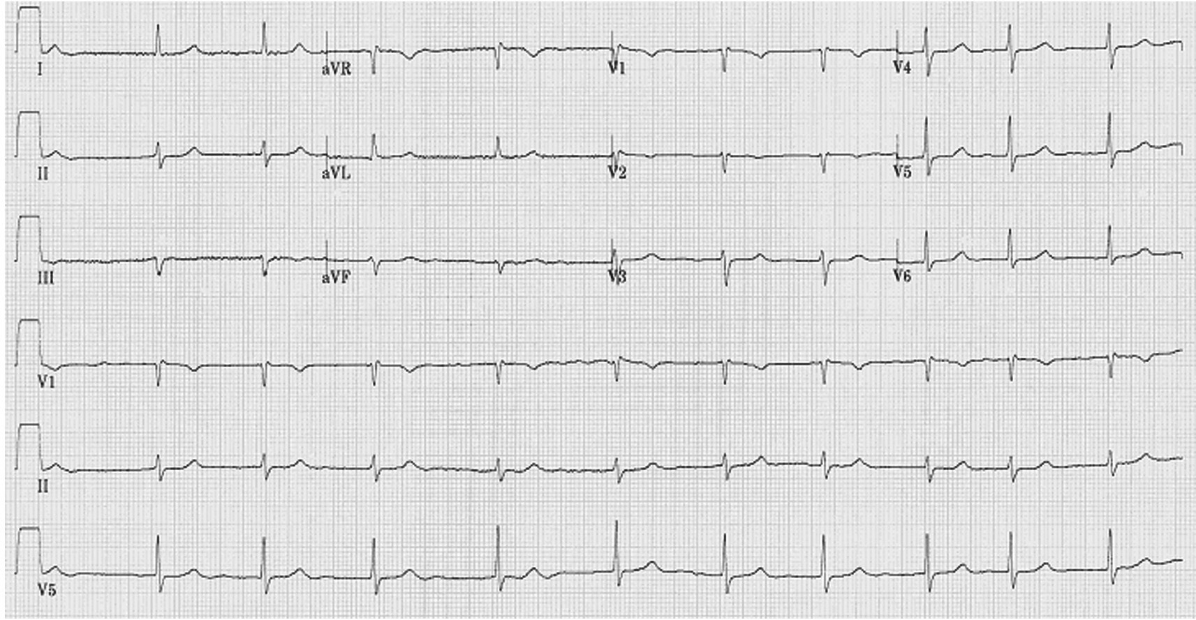 Cet ECG est difficile, il faut voir rapidement la bradycardie à 45 bpm due à l’association FA (trémulations remplaçant les ondes P) et bloc atrioventriculaire complet, probablement nodal car l’échappement est à QRS fins. Il s’agit aussi d’un SCA avec ST en inférieur et à un moindre degré en V1 et V2 avec miroir en D1 et aVL, V6 (latéral).