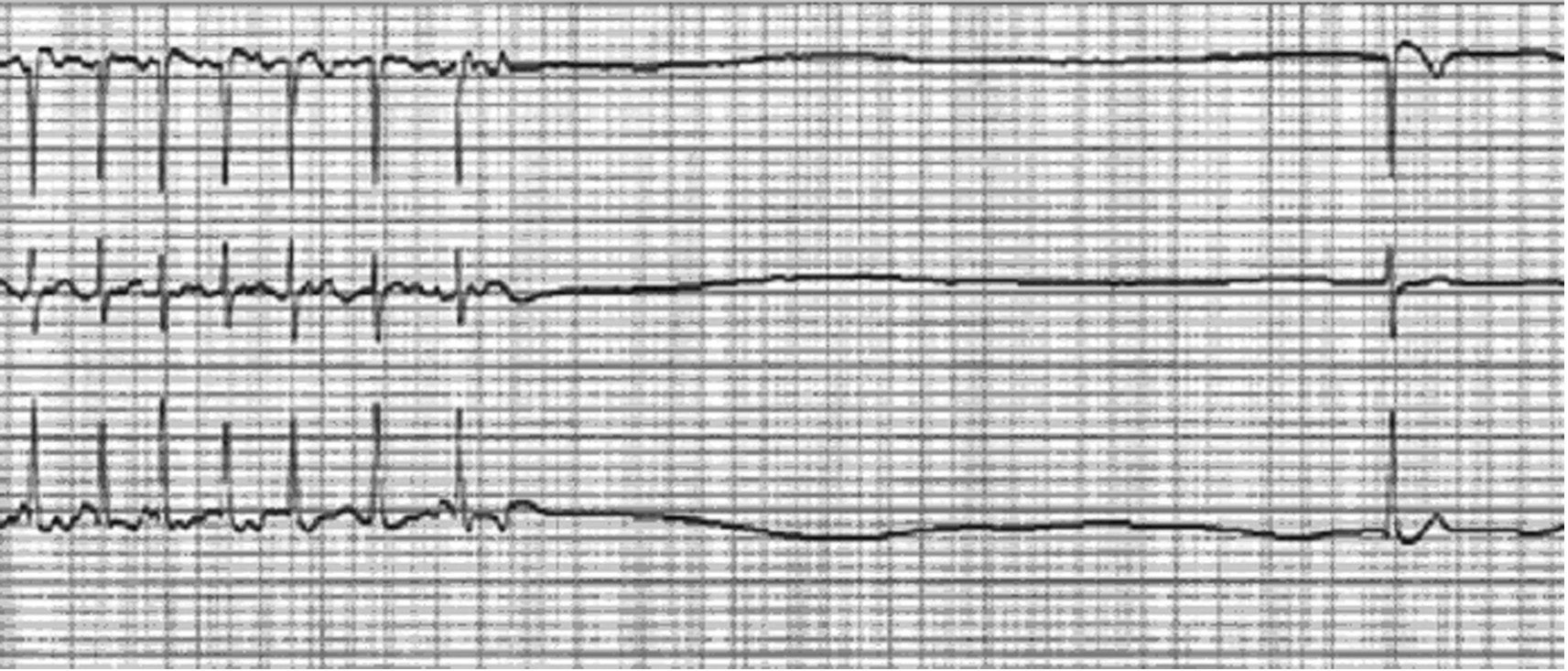 Pause de régularisation d’une fibrillation atriale (à gauche) par dysfonction sinusale associée réalisant un syndrome tachycardie – bradycardie, reprise de l’activité cardiaque sous la forme d’un échappement jonctionnel (à droite) car sans onde P visible.