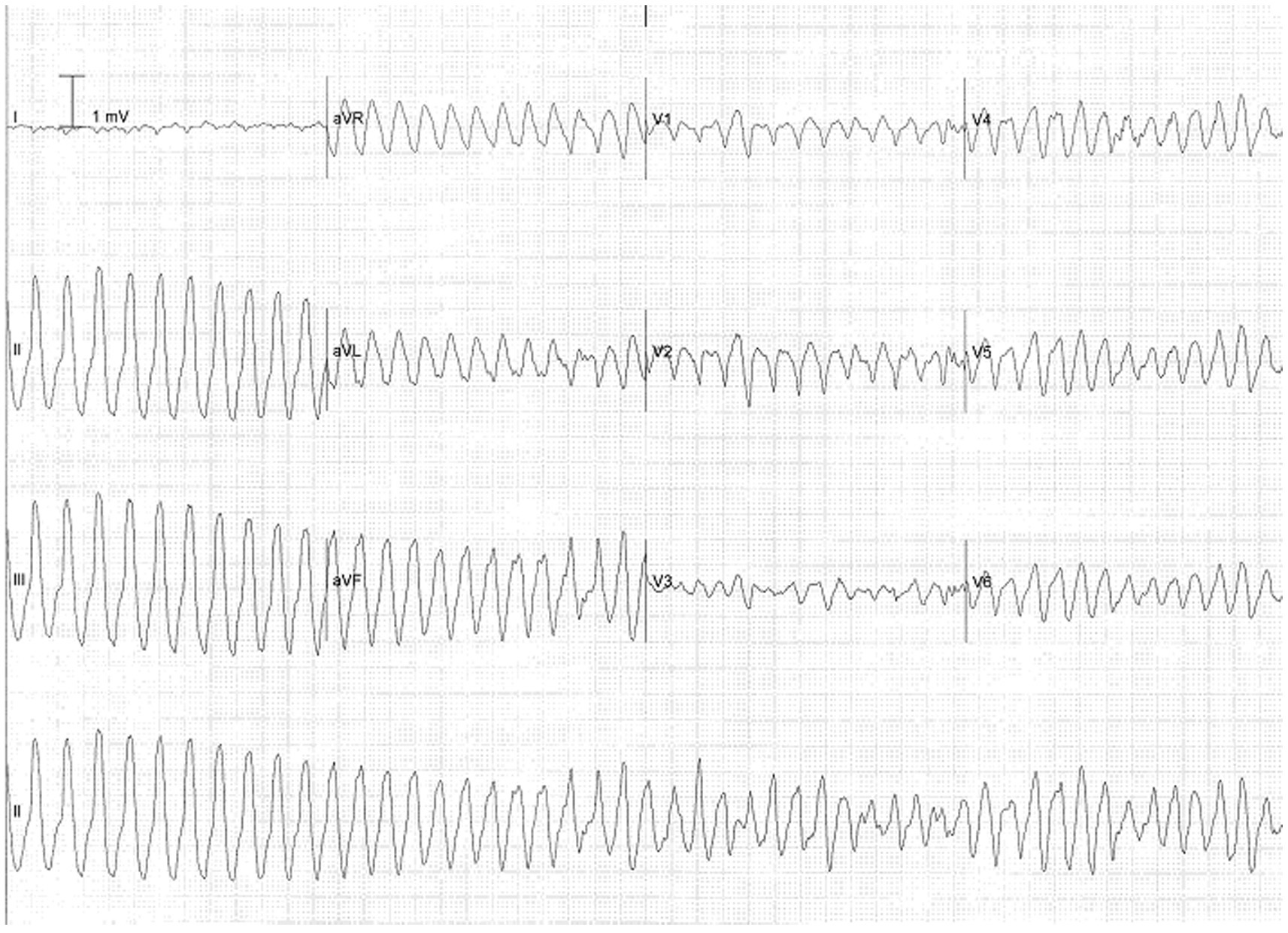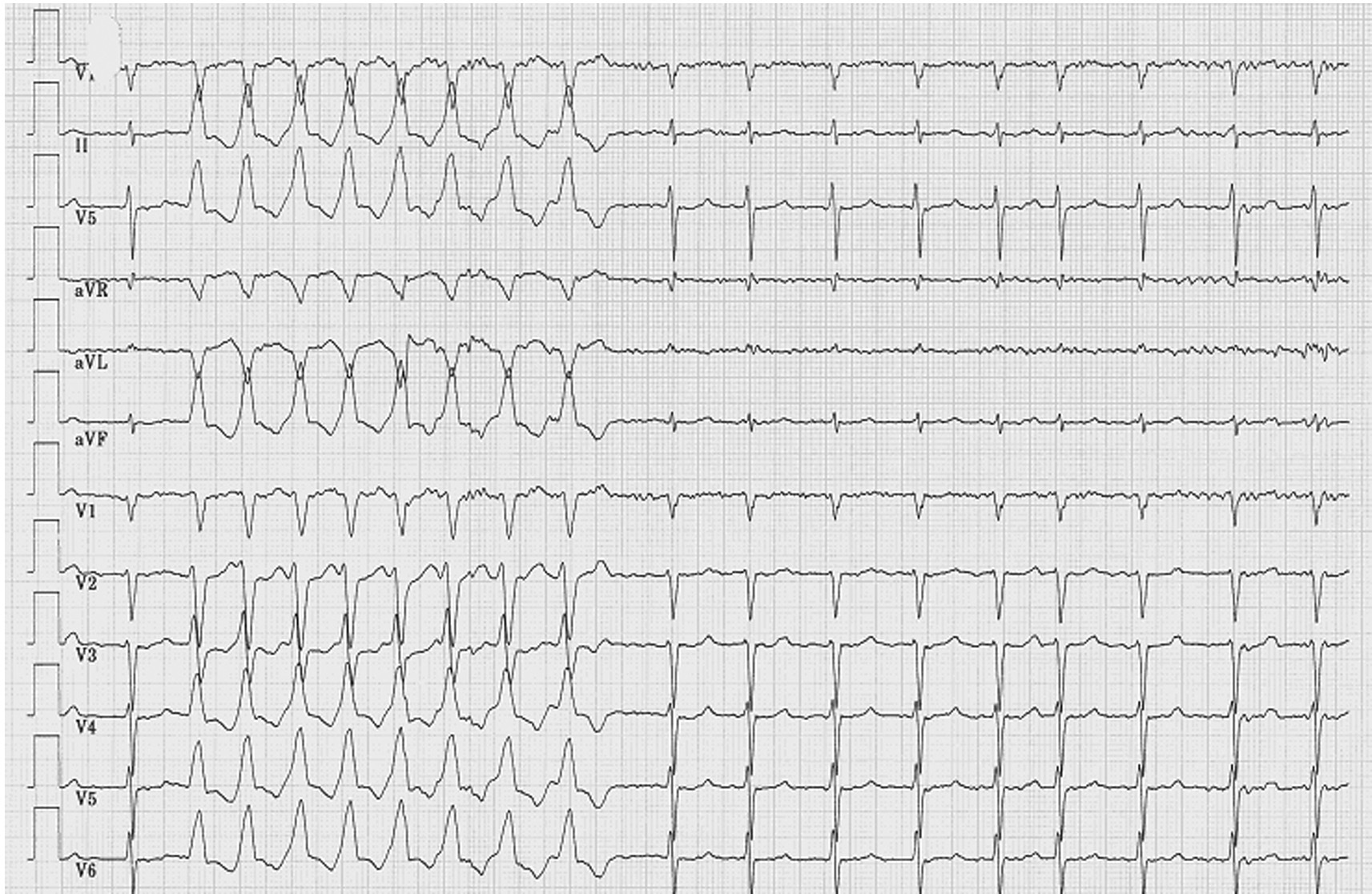 TV non soutenue ou salve d’extrasystoles ventriculaires (8 QRS) sur fond de fibrillation atriale, car activité atriale trémulante et QRS irréguliers après la TV.