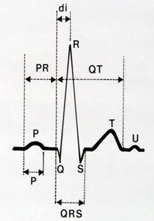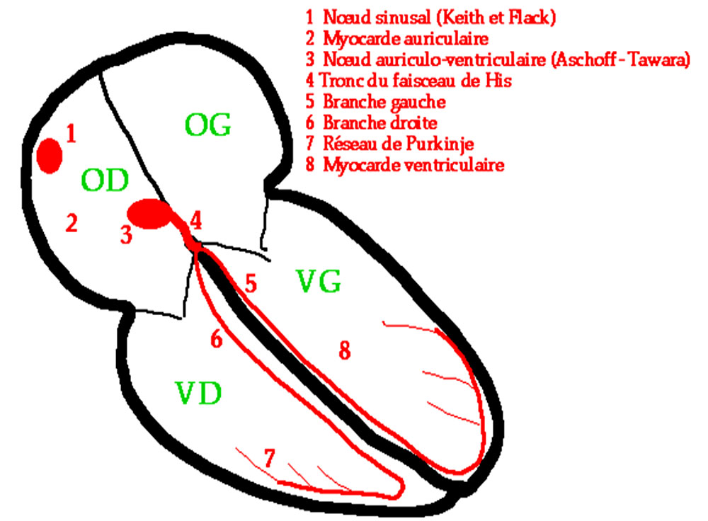 L’activité électrique cardiaque normale prend naissance dans le nœud sinusal puis se propage selon un cheminement déterminé (Figure 1) : nœud sinusal (1), myocarde auriculaire (2), nœud auriculo-ventriculaire d’Aschoff-Tawara (3), faisceau de His (4) et ses branches gauche (5) et droite (6), réseau sous-endocarditique de Purkinje (7), myocarde ventriculaire (8). Ainsi se succèdent sur le tracé ECG (Figure 2) la dépolarisation auriculaire (onde P), la dépolarisation ventriculaire (complexe QRS), puis la repolarisation ventriculaire (onde T, onde U).