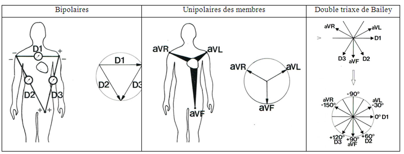 Ces six dérivations étant dans le même plan frontal, la translation de leurs axes au centre du triangle d’Einthoven permet de construire un système de coordonnées (double triaxe de Bailey), utile au calcul de l’axe du vecteur d’activation dans le plan frontal.