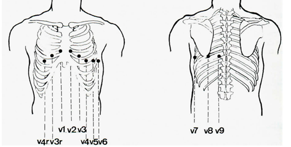 • V7, voire V8 et V9 : sur la même « horizontale » que V4, respectivement sur la ligne axillaire postérieure, sous la pointe de l’omoplate, au bord gauche du rachis