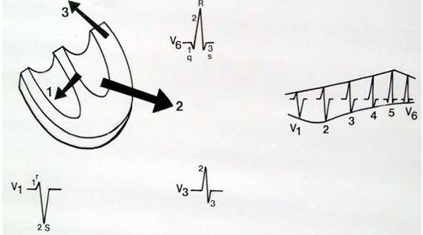 - un vecteur pariétal, de grande amplitude. La nette prépondérance de la masse ventriculaire gauche explique la direction vers la gauche et en bas de ce vecteur. Il détermine une positivité importante (onde R) en D1, D2, D3 et en précordiales gauches (V4, V5, V6) et une négativité importante (onde S) en V1 et aVR ;