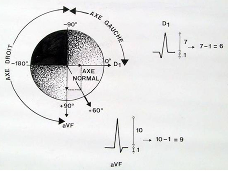 - La valeur normale de  QRS est de + 60° avec des variations chez le sujet normal, de 0 à 90°, en fonction de la morphologie du thorax. En dehors de ce quadrant, on parle de déviation axiale gauche ou droite. La valeur de  QRS est intéressante dans les hypertrophies et les troubles de conduction intra ventriculaire (hémibloc antérieur gauche si  QRS < -30°, postérieur gauche si ÂQRS > 120°).