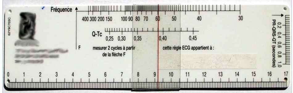 L’intervalle QT (début de QRS, fin de T) varie en fonction de la fréquence cardiaque. Pour une fréquence voisine de 60/mn, la durée de l’intervalle QT avoisine 0.4 s. Les réglettes à ECG indiquent la durée théorique de l’intervalle QT en fonction de la fréquence (Fig. 9). Le rapport maximal toléré (QT mesuré/QT théorique) est de 120 %.