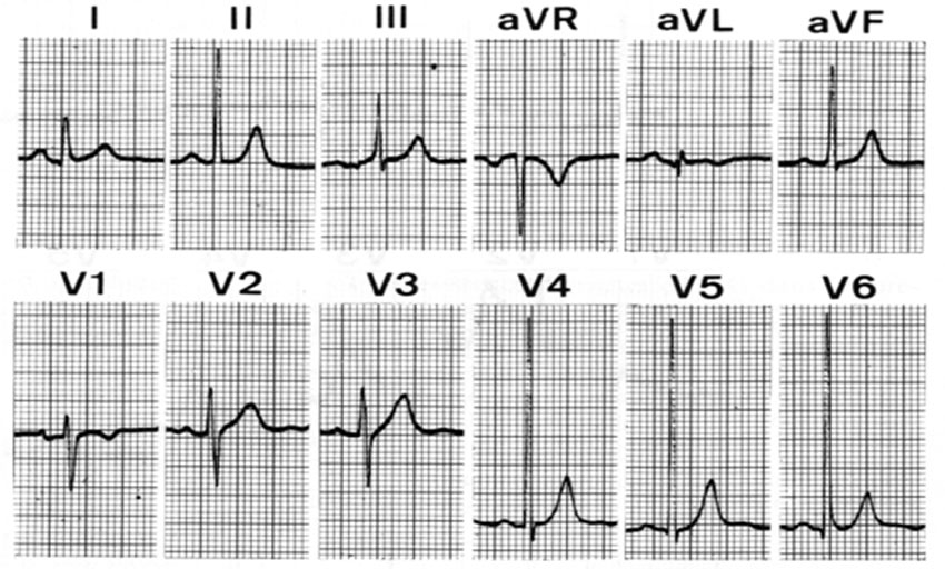La fréquence cardiaque plus élevée (120-140/mn la première année) s’accompagne d’accidents électriques plus brefs : onde P inférieure à 0.08 s, PR entre 0.10 et 0.18 s, QRS d’une durée inférieure à 0.09 s. A la naissance, la prépondérance électrique du ventricule droit explique les aspects ECG d’hypertrophie ventriculaire droite : axe de QRS dévié à droite, grandes ondes R en précordiales droites, avec onde T négative de V1 à V4. Ces aspects vont progressivement s’estomper et laisser place à l’aspect de prépondérance ventriculaire gauche.