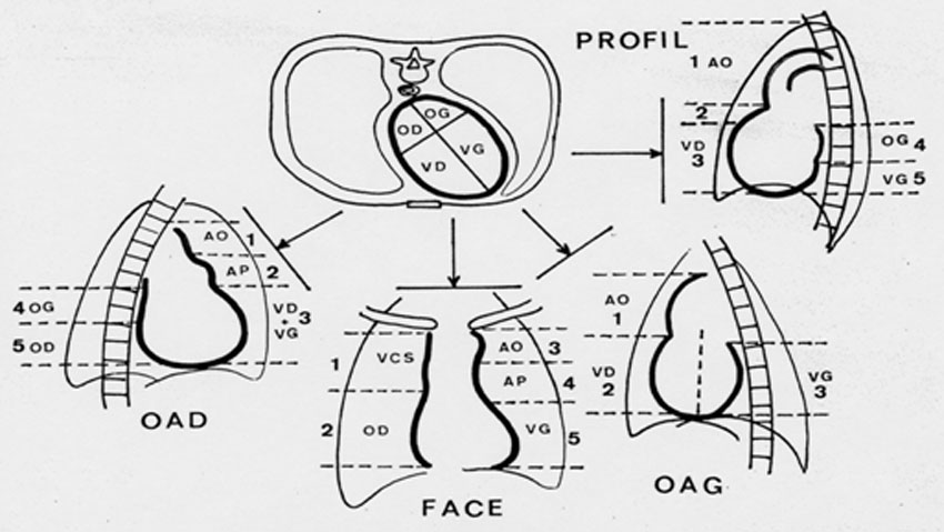 Dans chaque incidence, le pourtour du coeur est formé d’arcs qui correspondent aux différentes parties du coeur et des gros vaisseaux.