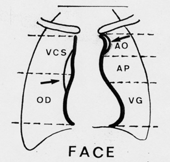 Chez le sujet âgé, l’aorte déroulée, de face, déborde l’arc supérieur droit et accentue l’arc supérieur gauche. (flèches sur figure 24).