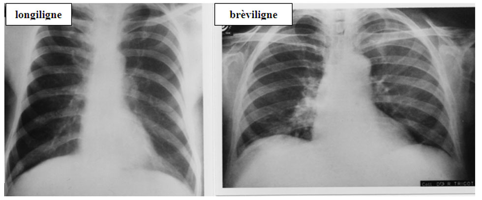 Chez le sujet bréviligne , le coeur apparaît « horizontal » c’est à dire étalé sur le diaphragme avec un pédicule vasculaire élargi. A l’inverse chez le sujet longiligne, le coeur est « vertical », allongé avec un pédicule vasculaire étroit.