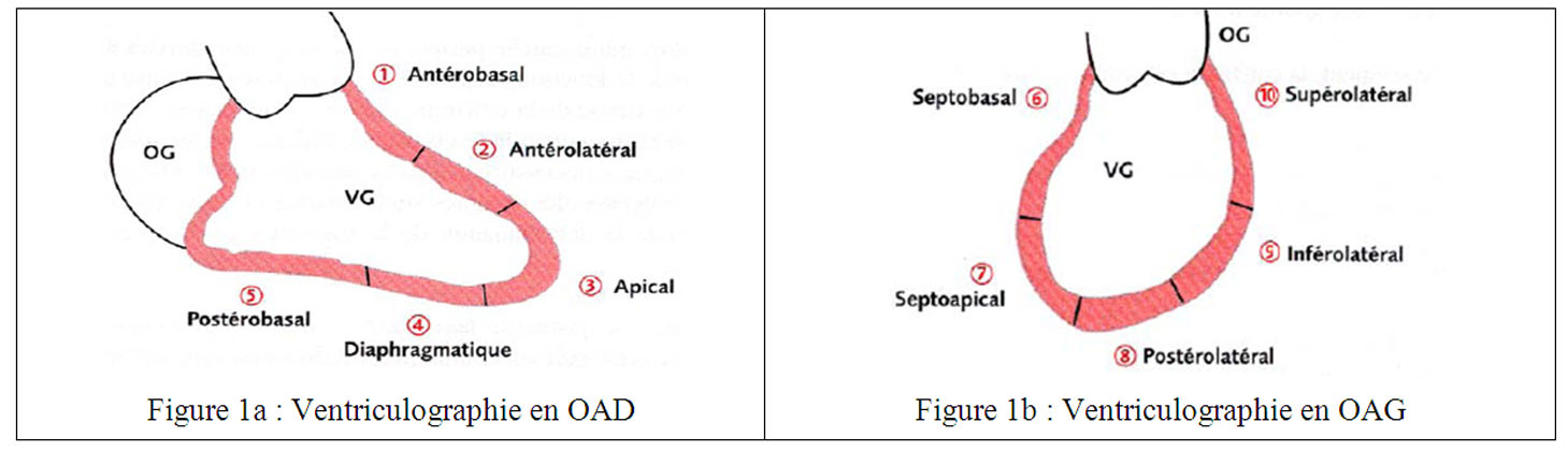 • soit dans le ventricule gauche (ventriculographie : figures 37a et 37b) ou dans l’aorte, par cathétérisme rétrograde transcutané de l'artère fémorale , humérale ou radiale . On réalise fréquemment plusieurs incidences, notamment les obliques antérieure droite et gauche.