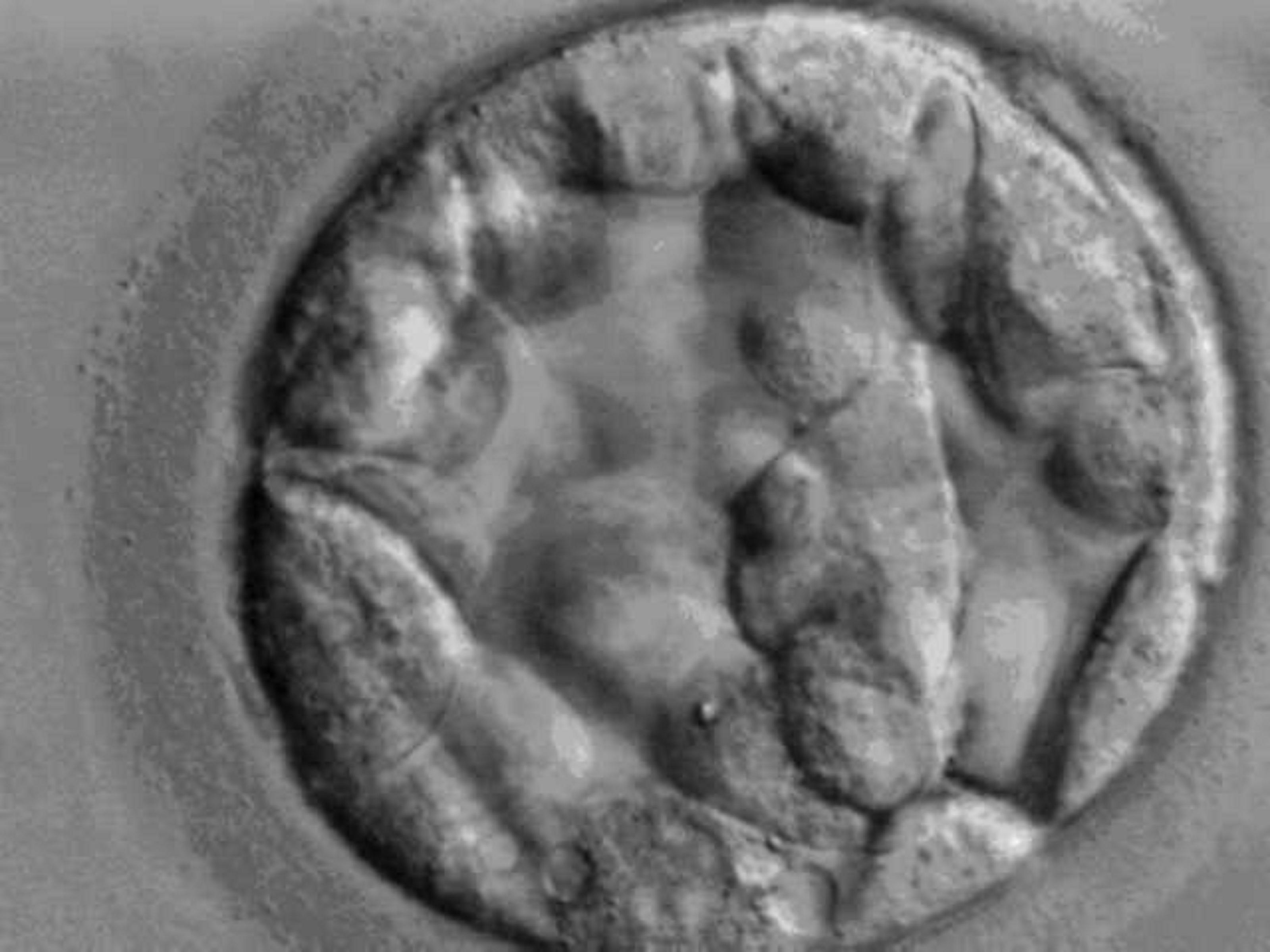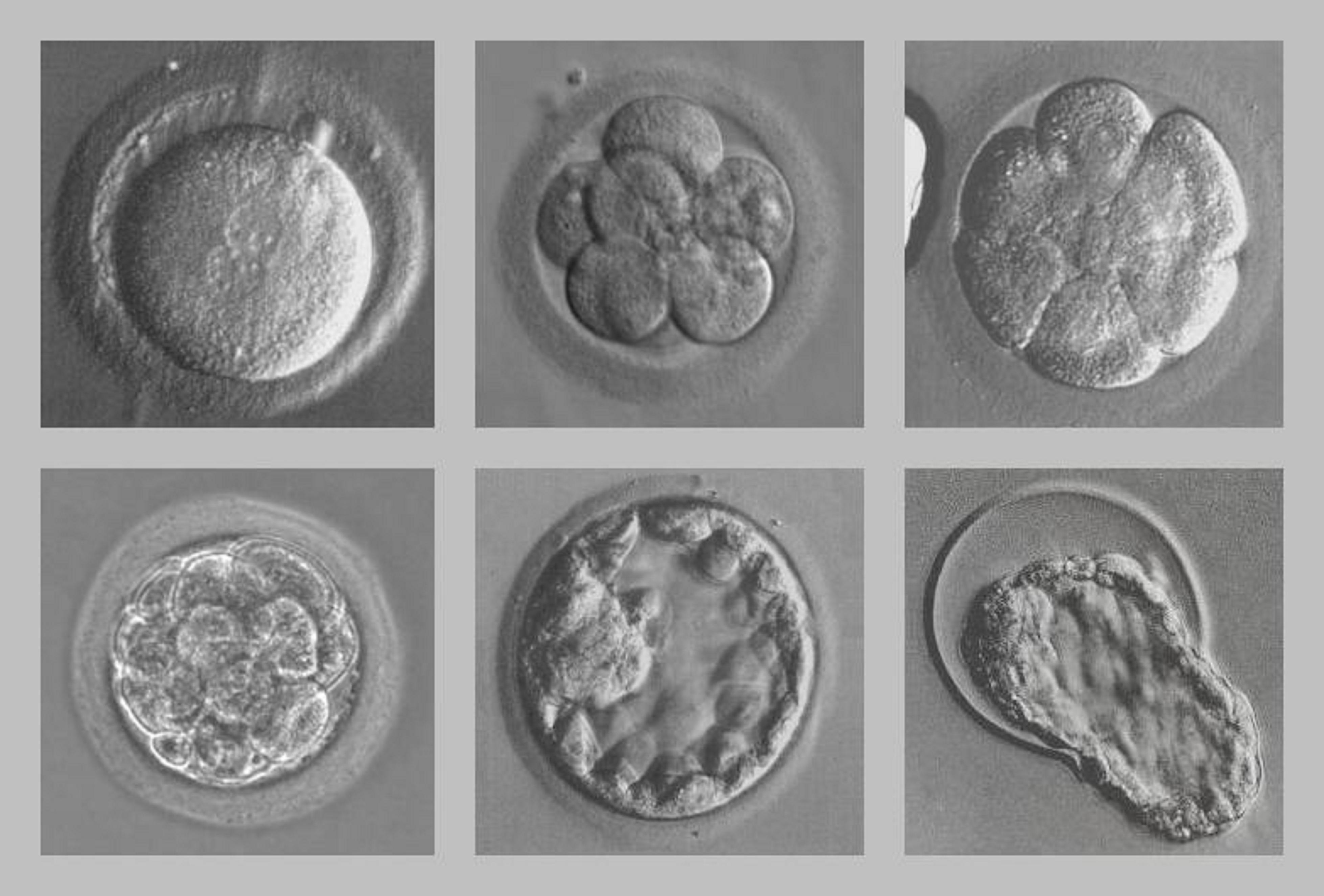 Embryon humain se développant in vitro. 1 : Œuf fécondé. 2 : Division en 8 cellules. 3 : Adhésion cellulaire. 4 : Morula compactée. 5 : Blastocyste. 6. Éclosion de la zone pellucide. (Sources : Wikipedia. Early Human Embryos [Internet]. Wikipedia; 2010.)