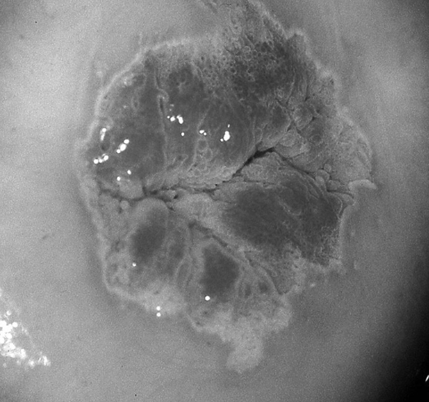 Le test de Schiller : l’application de lugol provoque une coloration brune homogène, transitoire (environ 10 minutes) et d’intensité proportionnelle à la teneur en glycogène des couches superficielles de la muqueuse. Les muqueuses malpighiennes atrophiques, immatures ou dysplasiques, la muqueuse glandulaire et les zones ulcérées sans revêtement malpighien ne se colorent pas (aspect jaune) (figure 18.9).