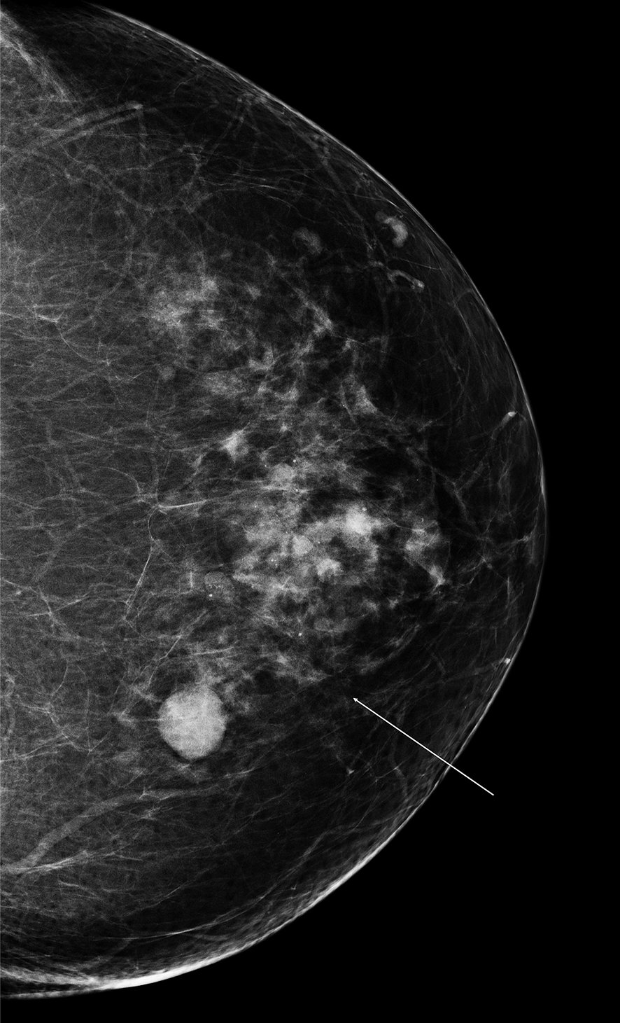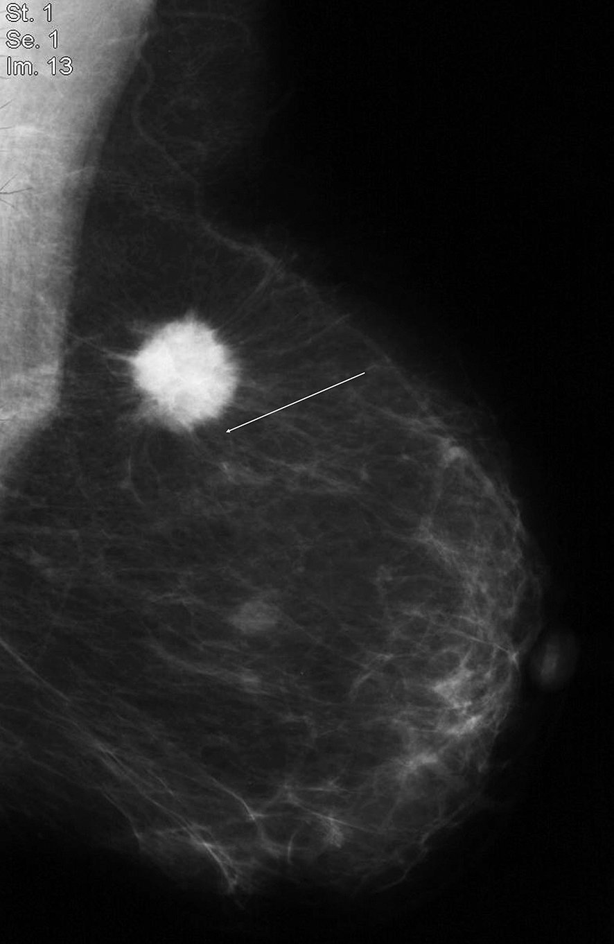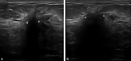 Figure 20.9. A, B Image échographique suspecte d’un cancer du sein (contours flous, irréguliers, grand axe perpendiculaire à la peau, cône d’ombre postérieur)