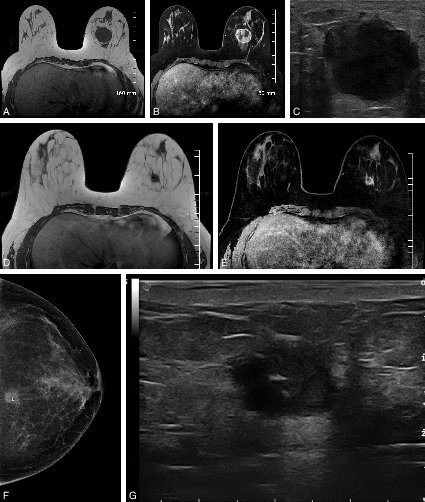 A, B, C. Bilan d’imagerie avant chimiothérapie néoadjuvante. D, E, F, G. Bilan d’imagerie en fin de chimiothérapie, avant la chirurgie.