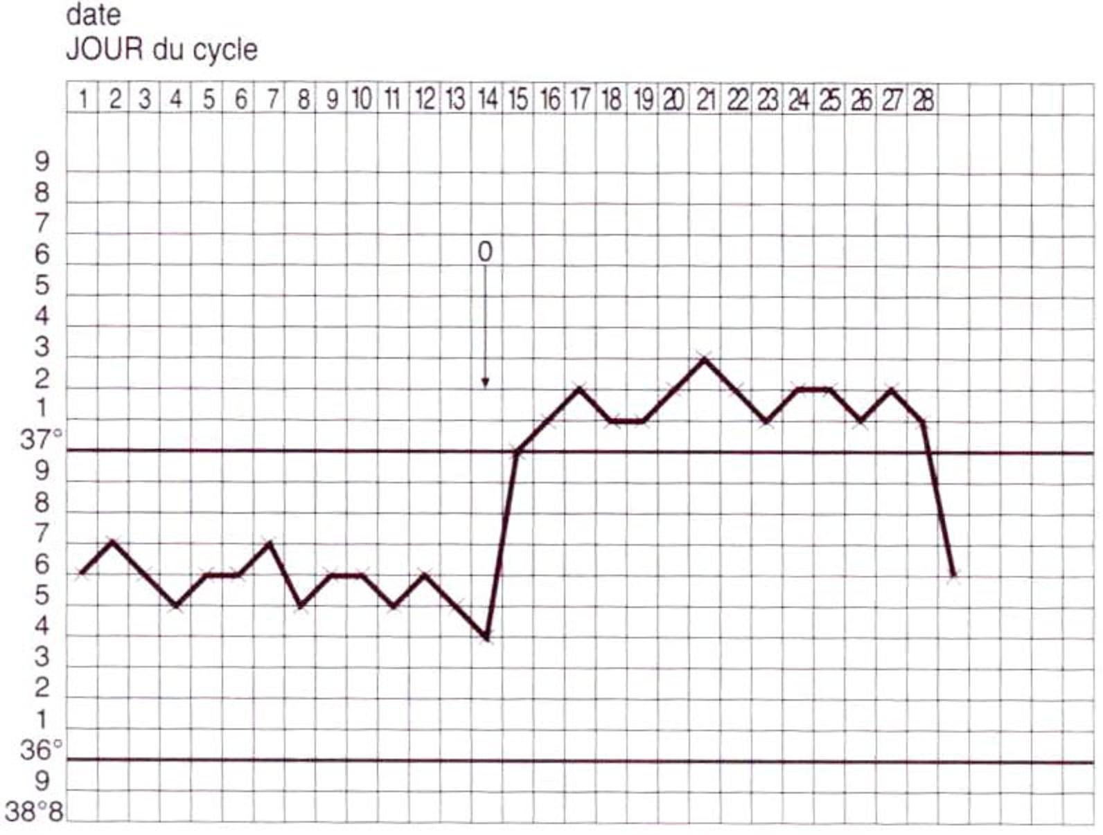 Normalement, en première partie de cycle, la température basale se maintient aux environs de 36,5°. Puis de façon brutale la température monte : c'est le décalage post-ovulatoire. L'ovulation est repérée comme étant le point le plus bas (nadirDéfinitionChiffre le plus bas observé. de la courbe) avant l'ascension de la courbe. Suit un plateau thermique de 12 à 14 jours puis la température retombe (figure ci-après).
