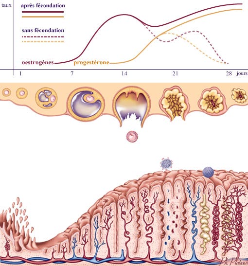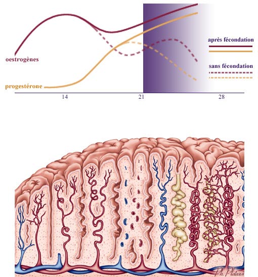 Les modifications de l'endomètre sont peu différentes de celles observées au cours d’un cycle menstruel sans fécondation mais elles rendent l'endomètre propice à l'implantation.