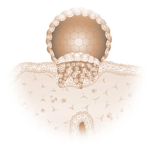 La deuxième semaine du développement est celle de la fixation de l'oeuf dans la paroi (implantationDéfinitionPénétration de l'oeuf dans la paroi utérine)  et de l’individualisation de l’embryon  sous la forme du disque embryonnaireDéfinitionTerme désignant l'embryon avant la délimitation: il présente alors effectivement un aspect aplati évoquant un disque.. Ces deux ordres de transformations auront pour résultats le développement des annexes embryonnairesDéfinitionEnsemble des structures de l'oeuf (ou zygote) qui n'entrent pas dans la constitution du disque embryonnaire et l’apparition des premiers tissus embryonnaires, leur déroulement harmonieux dépend des modifications intervenant au niveau de l’organisme maternel.