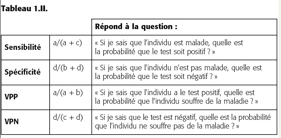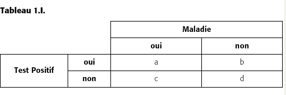 Dans une approche probabiliste large, tout élément participant à l’élaboration diagnostique (symptôme, signe clinique, test ou examen) est doté de caractéristiques qui ont nom sensibilité (Se), spécificité (Sp), valeur prédictive positive (VPP) et valeur prédictive négative (VPN). Le tableau 1.I permet de se remémorer ces notions.