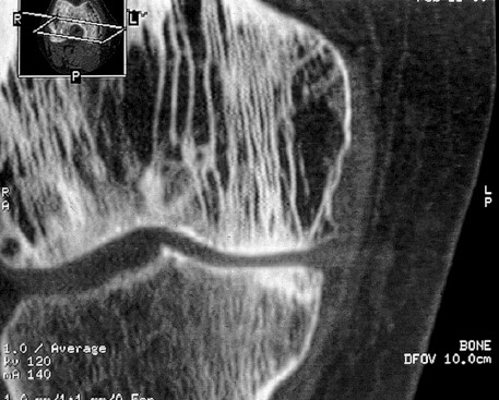 – une condensation osseuse trabéculaire, constituée de travées osseuses grossières, épaissies, dont l’orientation est anarchique ;
