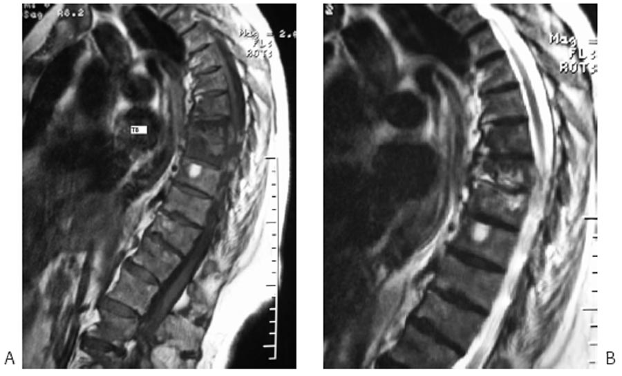 A. En T8 : discrète diminution de hauteur de la partie antérieure du corps vertébral dont le bord antérieur et le plateau inférieur sont flous. B. Deux mois plus tard : ostéolyse du tiers antéro-inférieur du corps vertébral de T8 et pincement de l’espace intervertébral.