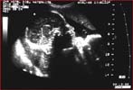 En cas d’atteinte bilatérale, le bourgeon médian peut réaliser une masse centrale saillante à ne pas confondre avec un tératome ou un probocis. Il est limité par des encoches anéchogènes et semble appendu au nez.