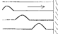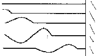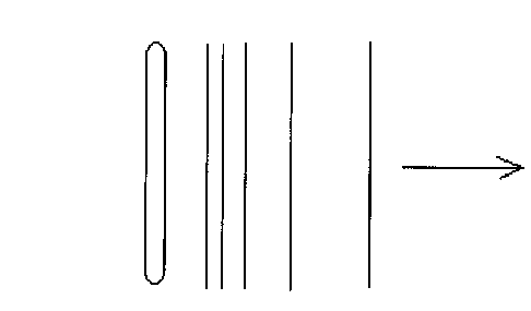 4ème exemple : baguette vibrant dans l'eau : La déformation longitudinale se propage de façon plane en s'atténuant ; de plus, la direction de déformation du milieu est parallèle à celle de la propagation et tous les points d'un même signal s'alignent sur un même plan. |