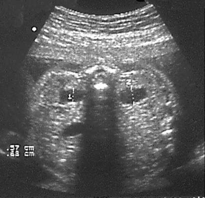 (petite lacune liquidienne à contours réguliers dont la longueur ne doit pas dépasser 20 mm). Les calices se répartissent autour du bassinet. Calices et bassinet ne doivent pas avoir une forme arrondie globuleuse qui traduirait une augmentation trop importante de la tension intra-cavitaire.