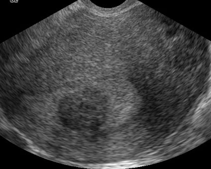 Myome sous-muqueux, arrondi, hypoéchogène par rapport à l’endomètre (Cliché : Dr. C. TALMANT)