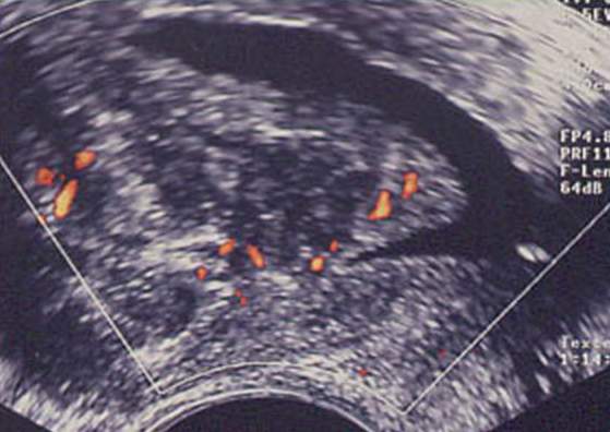 Hystérosonographie. Image intra-cavitaire vascularisée au doppler couleur Adénocarcinome de l’endomètre