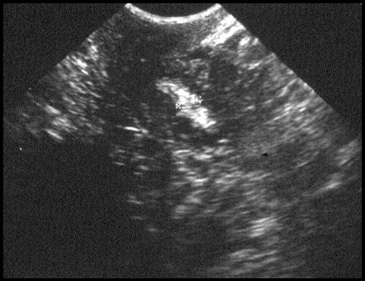 Caillots. Hyperéchogène, aspect de polype, image mobile. Pas de flux au Doppler couleur