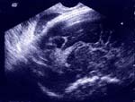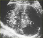 Echographiquement : Masse très échogène occupant plus d’un hémisphère cérébral