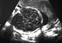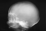 La projection de profil du crâne illustre bien la vaste fenêtre fontanellaire créée par la synchondrose de Budin qui permet d'accéder aux hémisphères cérébelleux tant qu'ils ne sont pas enfouis sous les lobes occipitaux, (au-delà de 34 SA).