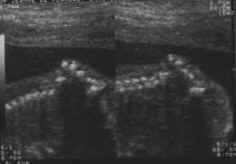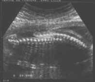 En échographie : Cloison échogène entre les points d'ossification postérieurs de la vertèbre. "Troisième point d'ossification postérieur" avec lames latérales anormalement écartées.