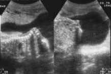 Hernie méningée remplie de LCS , faisant saillie en arrière du rachis, anéchogène, généralement à paroi fine parcourue par des travées neurologiques, échogènes, distribuées de façon linéaire ou anarchique avec placode neurale possible sur la paroi herniaire (cliché 4).