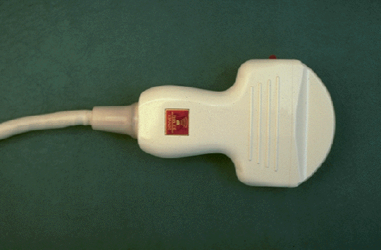 Sonde abdominale convexe. La fréquence varie de 3,5 à 5 Mégahertz, la convexité permet un secteur large d'exploration.