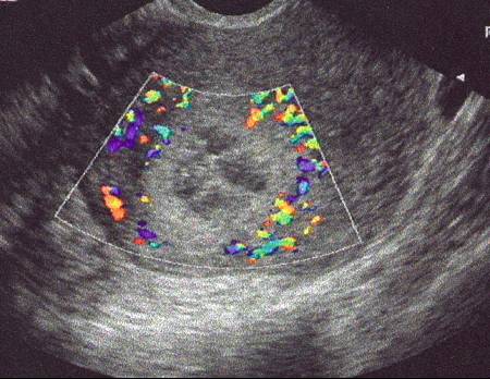 Myome en nécrobiose. Doppler couleur (Cliché : Dr. C. TALMANT)
